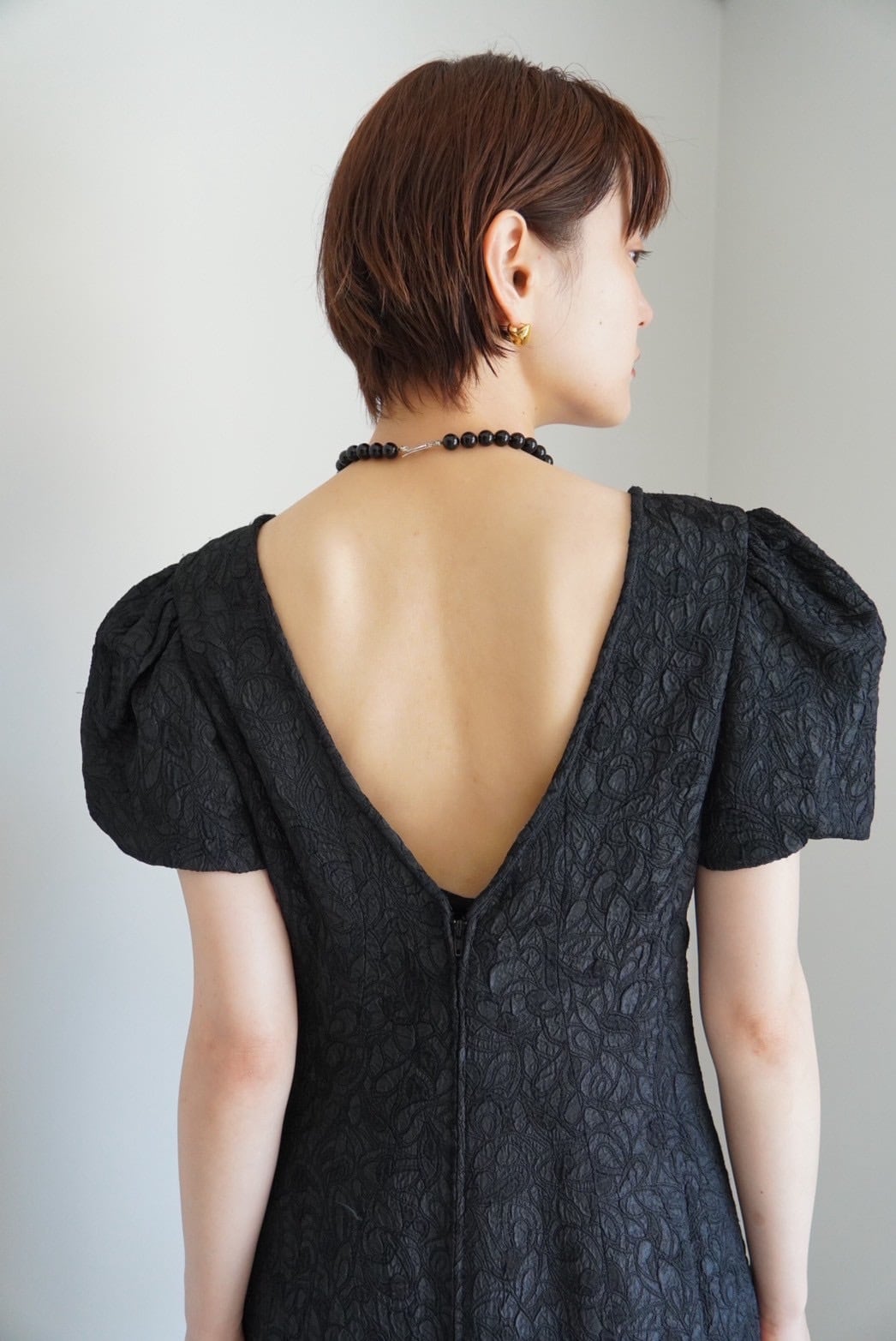 パフスリーブとバックが大胆に開いたデザインも女性らしく魅力的です。