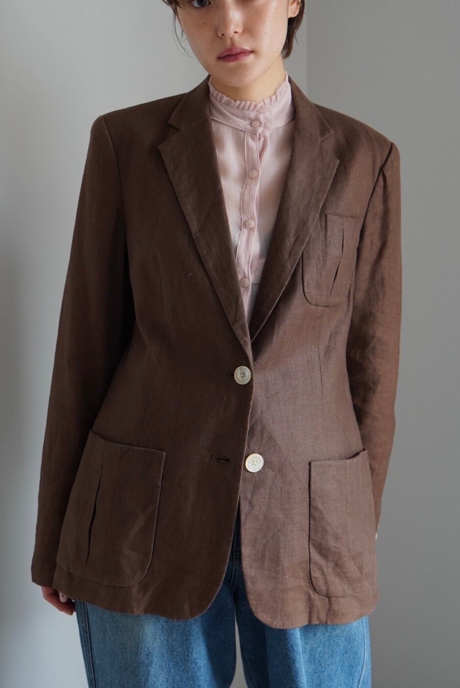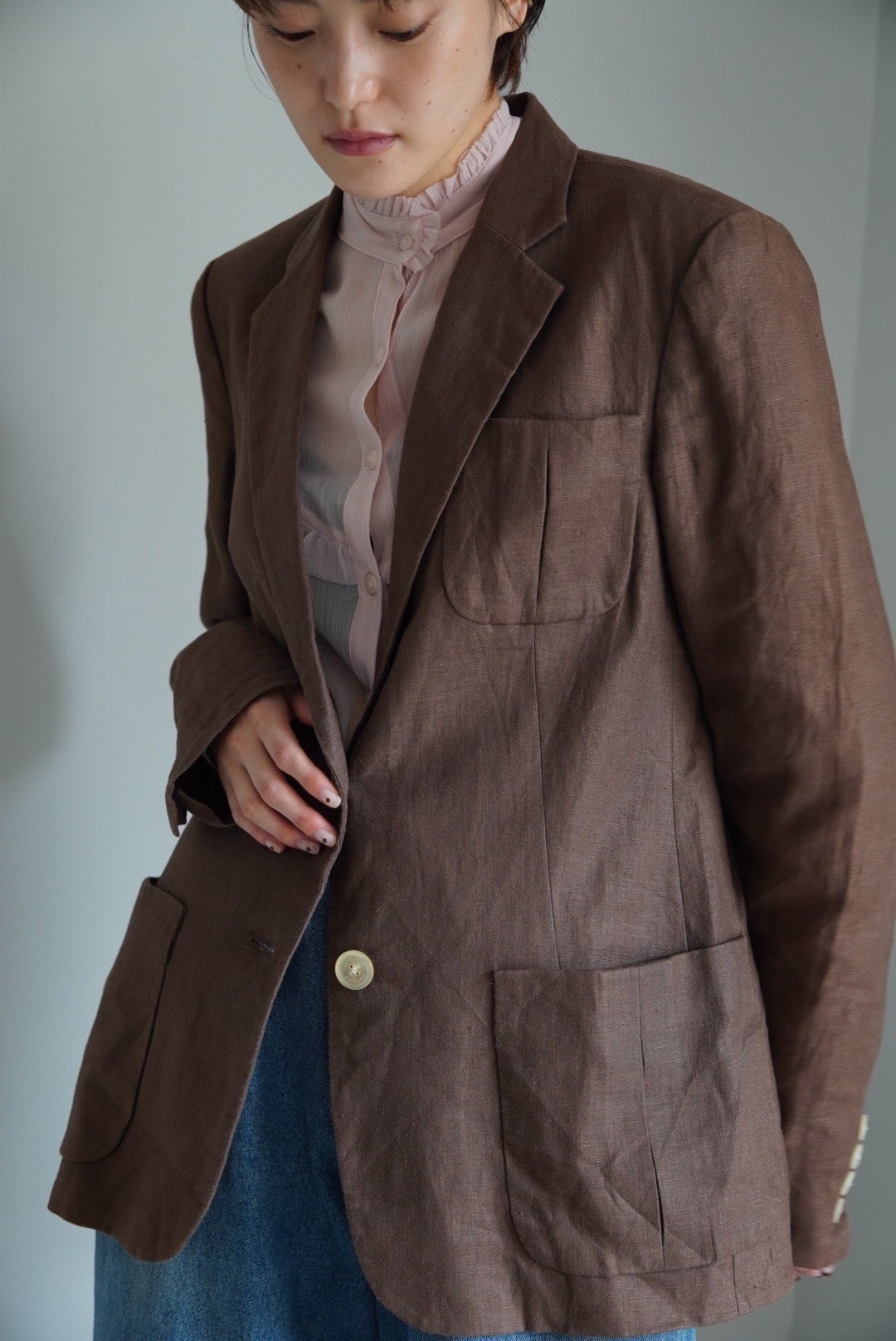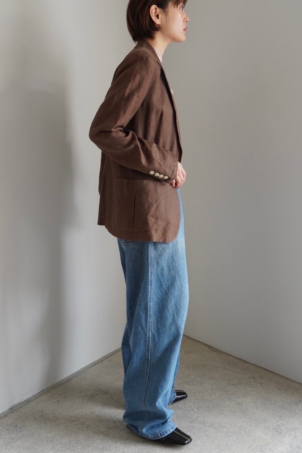 ボクシーなシルエットでハンサムながらも、細かいディテールで女性らしい印象です。