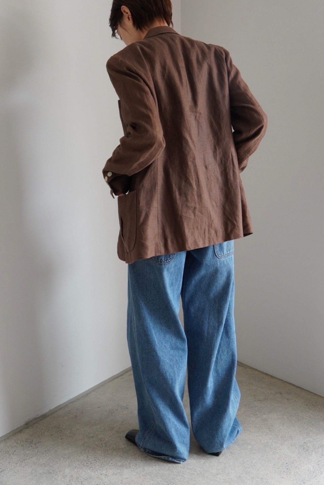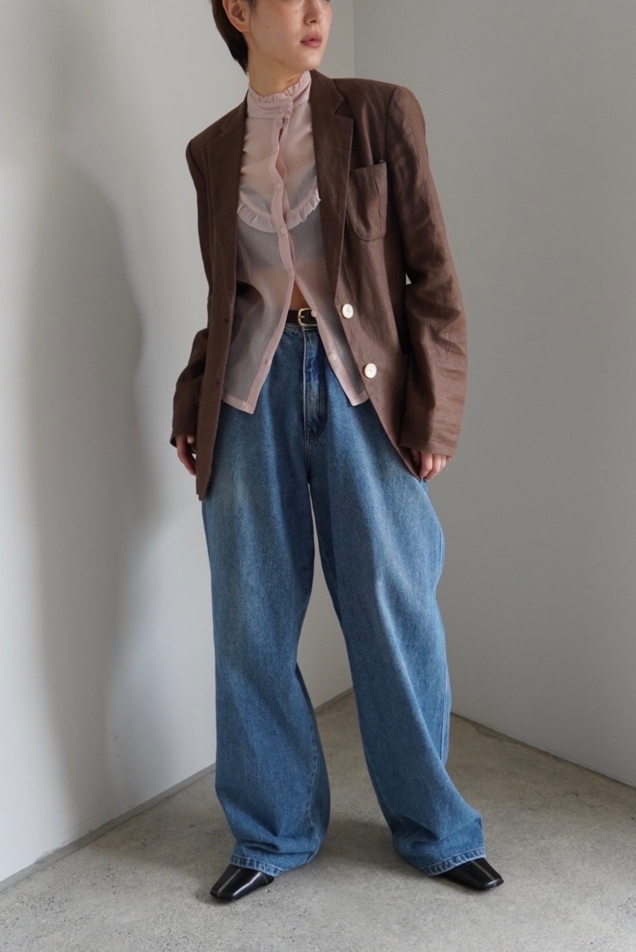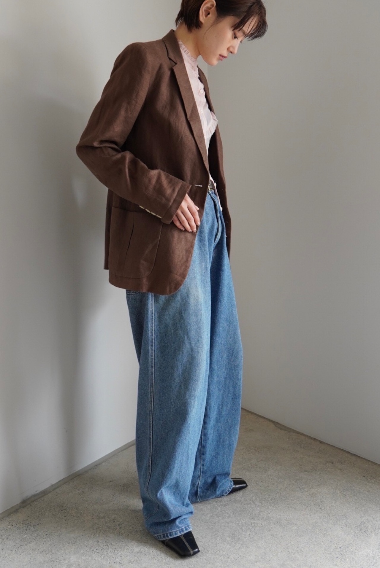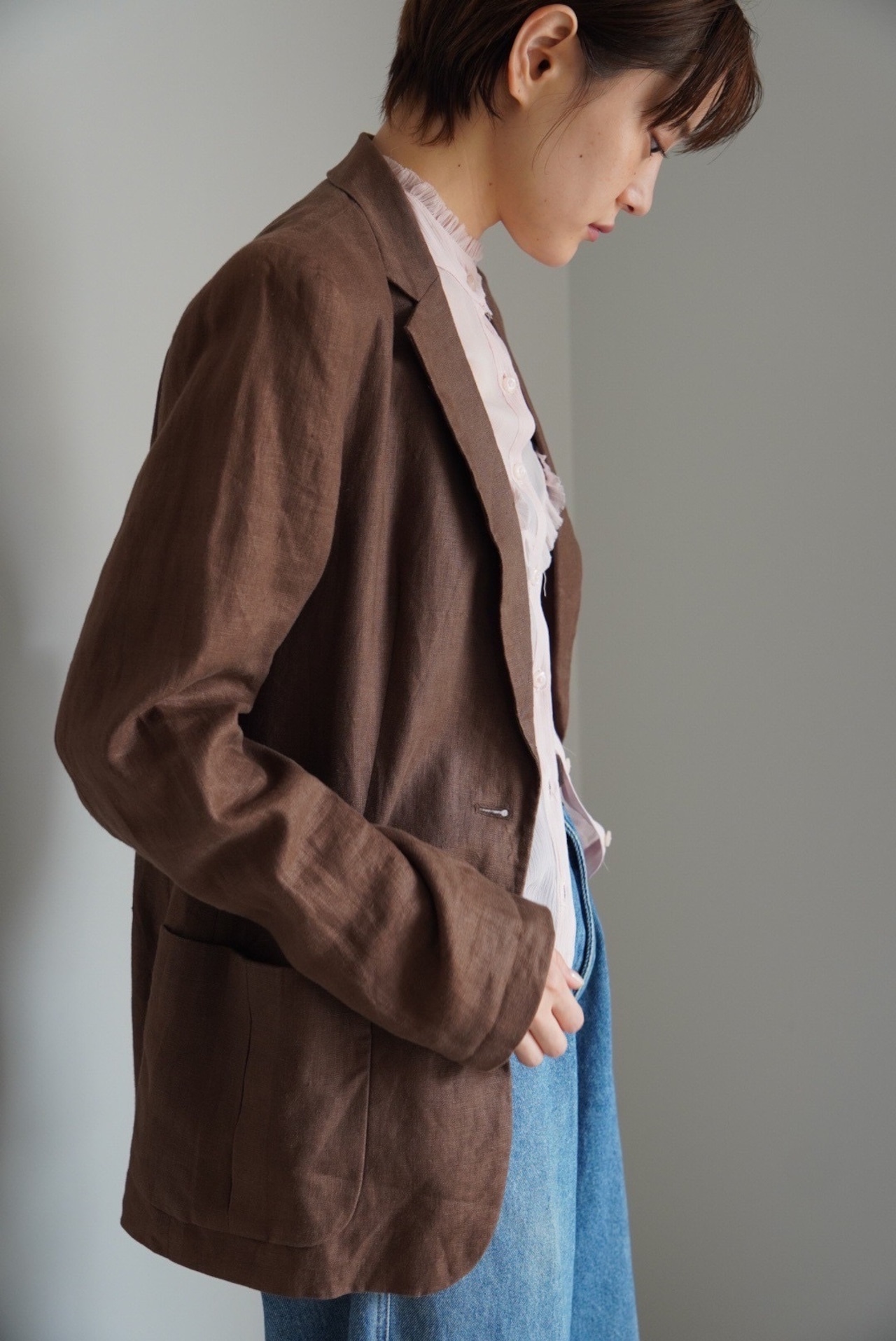 ボクシーなシルエットでハンサムながらも、細かいディテールで女性らしい印象です。