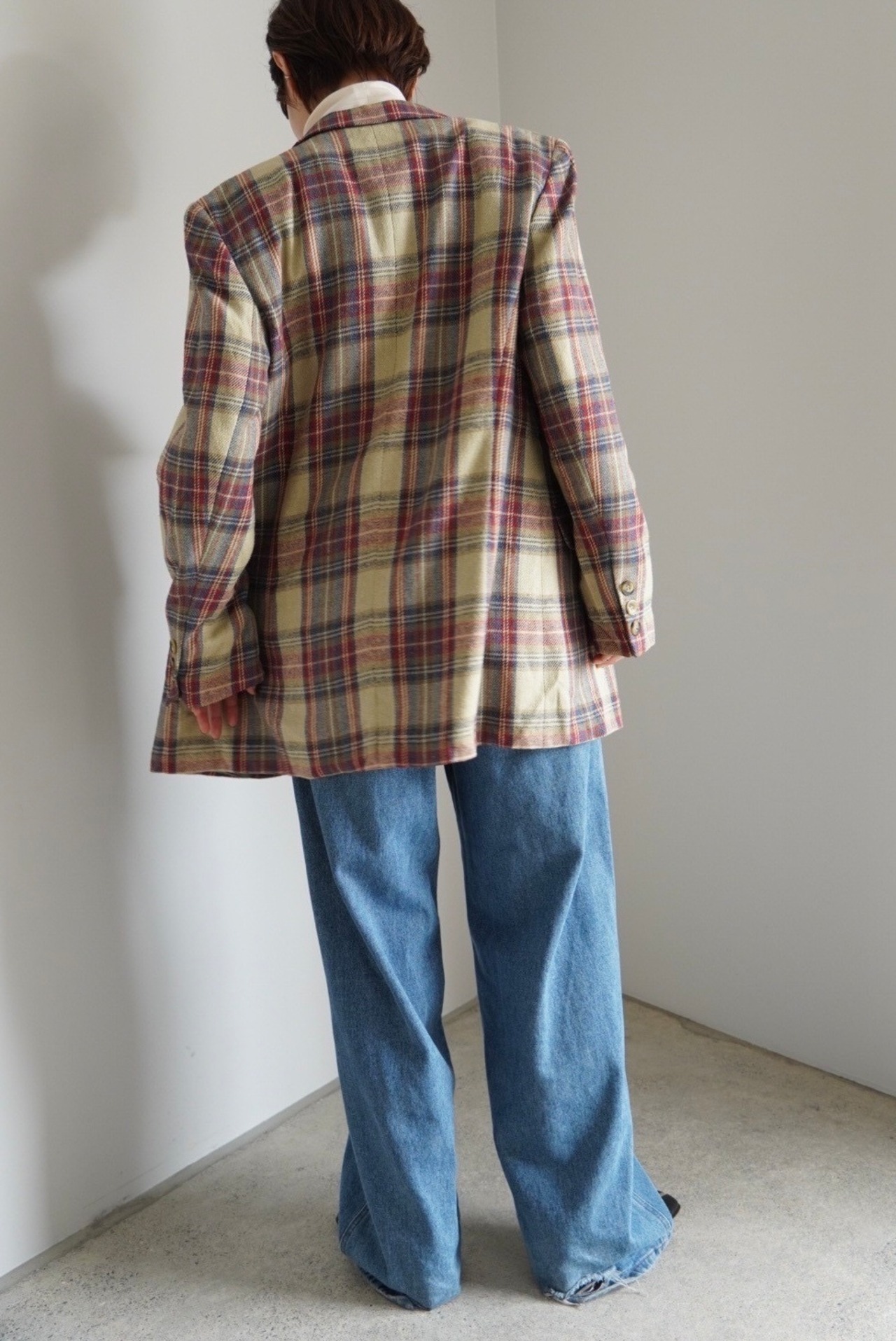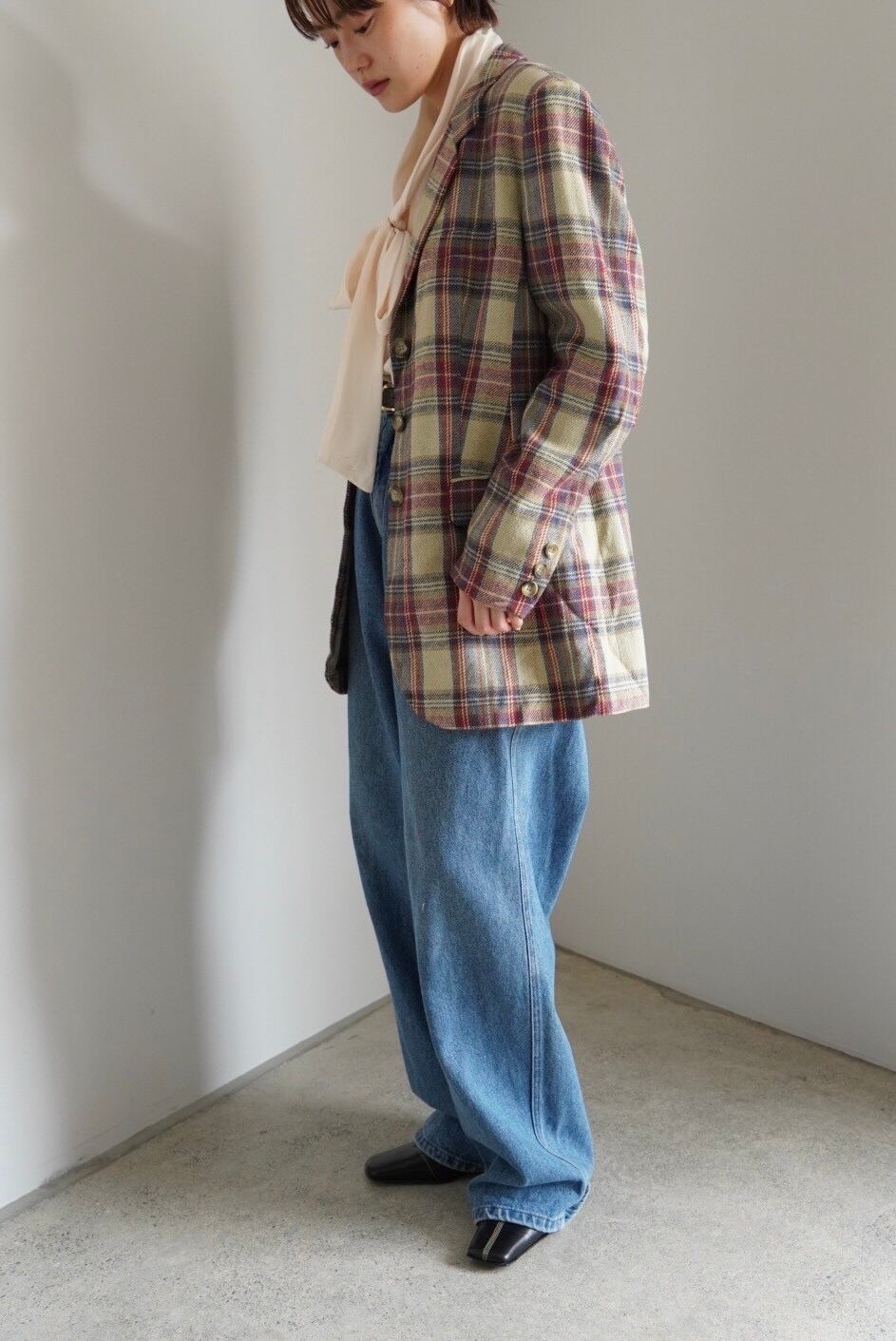 チェック柄がいい野暮ったさの為、デニムや首周りの抜け感でバランスをとりました。