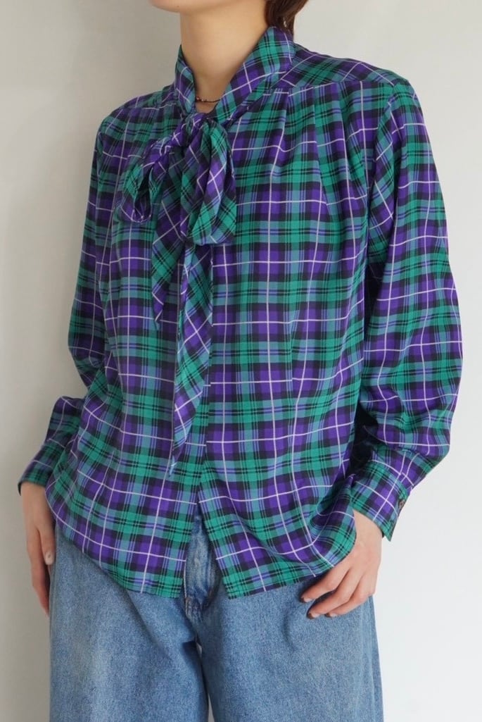秋らしいカラーのシアー素材のチェックデザインブラウス。