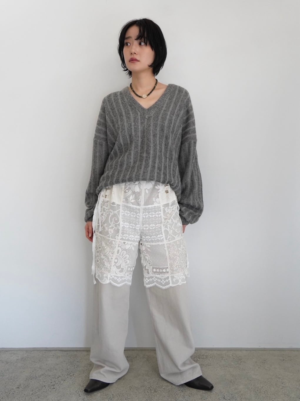 柔らかいグレーカラーとルーズなシルエットが可愛いVネックニット。